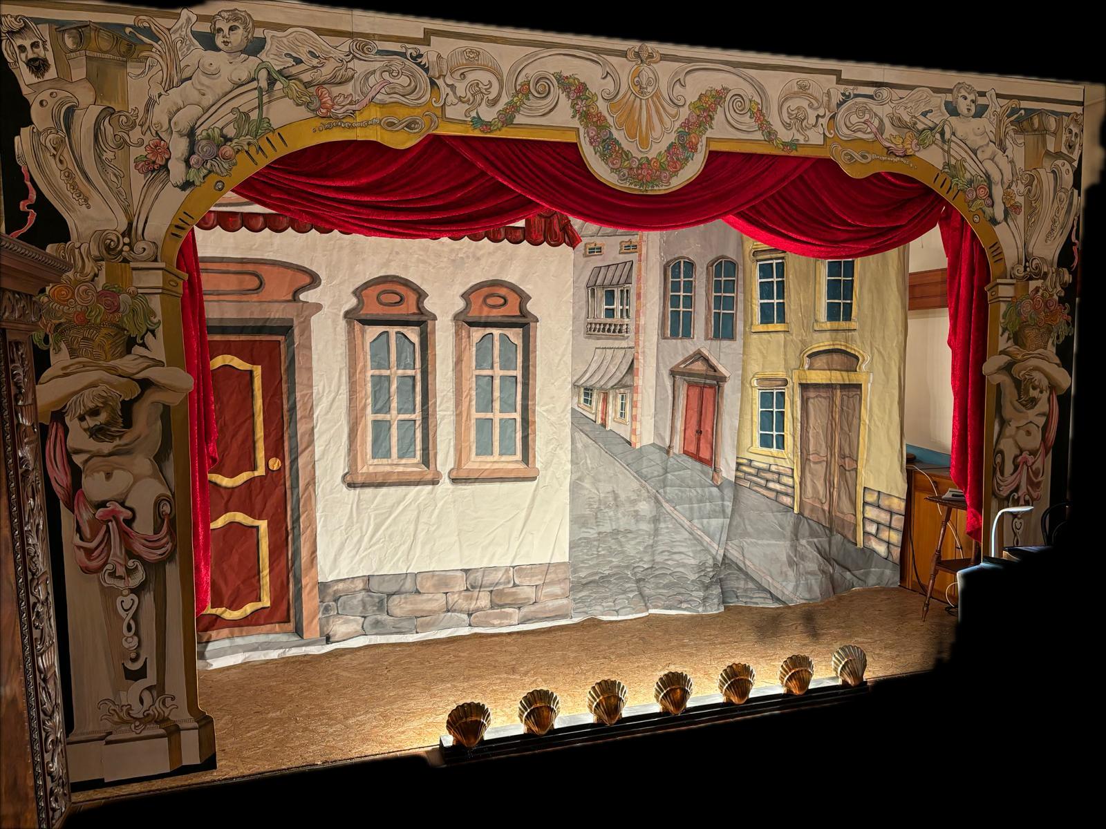 Holzbühne nach barockem Vorbild zum Zusammenstecken, inkl. rotem Samt-Vorhang und zwei Bühnenbildern: